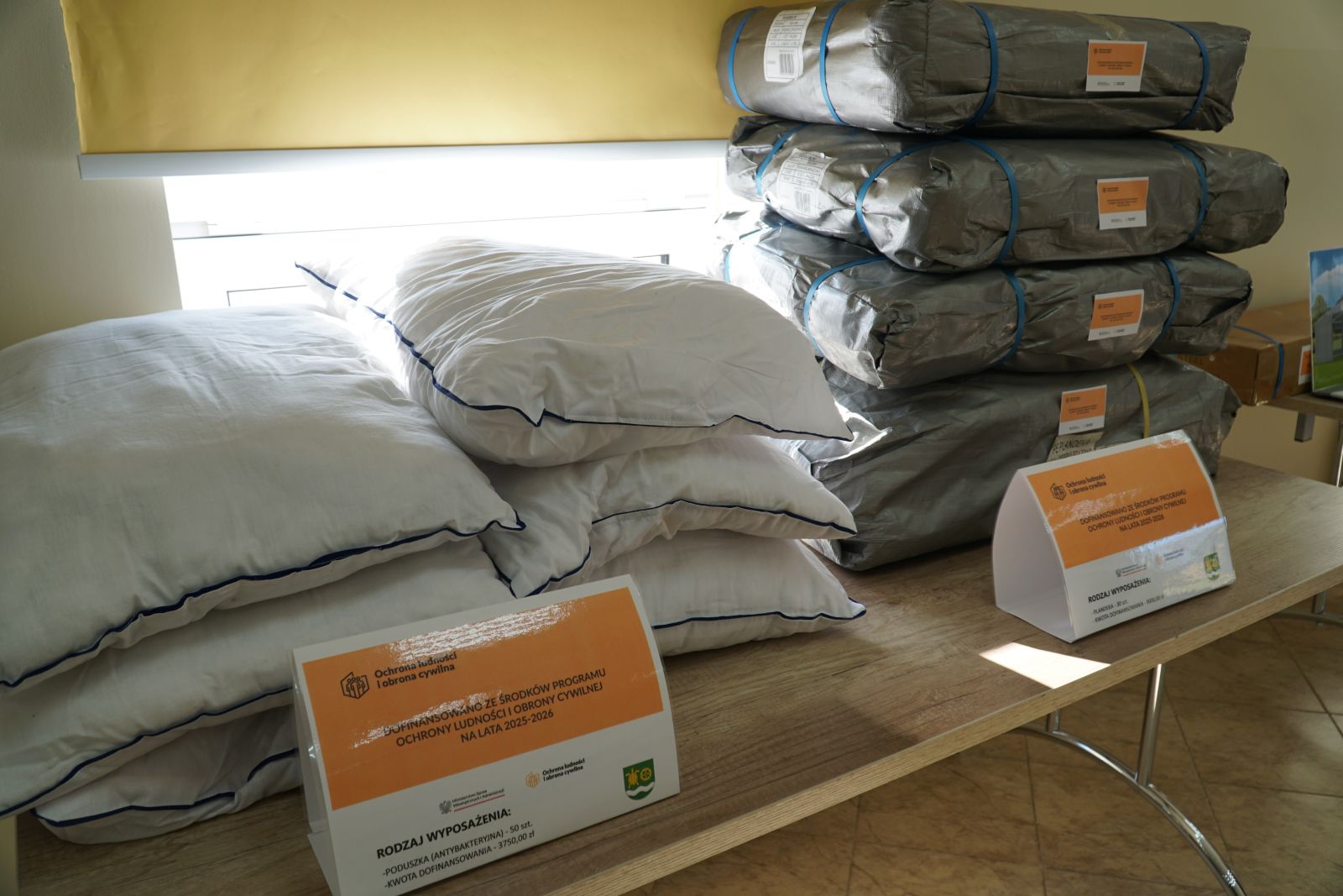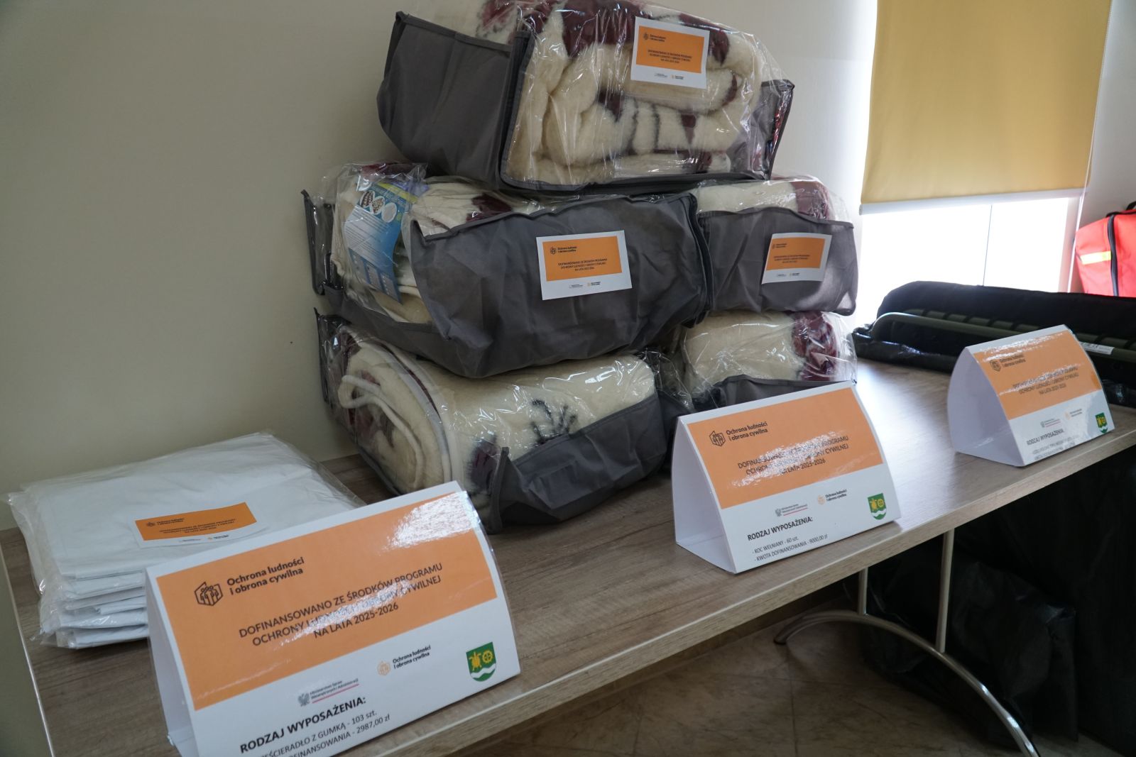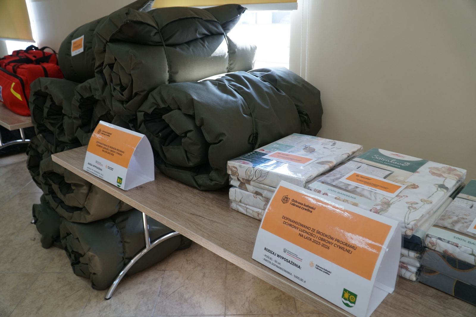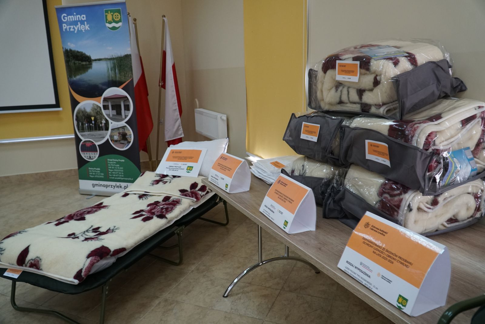 W ramach pierwszego zadania gmina zakupiła szeroki zakres wyposażenia, które umożliwi organizację tymczasowego zaplecza dla osób poszkodowanych lub ewakuowanych. Do gminy trafiło między innymi 21 łóżek polowych typu wojskowego wraz z materacami, 54 koce, 60 kompletów pościeli oraz 60 koców wełnianych, które pozwolą szybko zorganizować miejsca noclegowe w sytuacjach wymagających natychmiastowej pomocy.